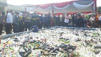 Polda Jatim memusnahkan 5,5 kg sabu, 78.617 botol miras, hingga 26 ribu pil double L. Barang haram ini didapat dari Operasi Pekat Semeru yang digelar 2 minggu.